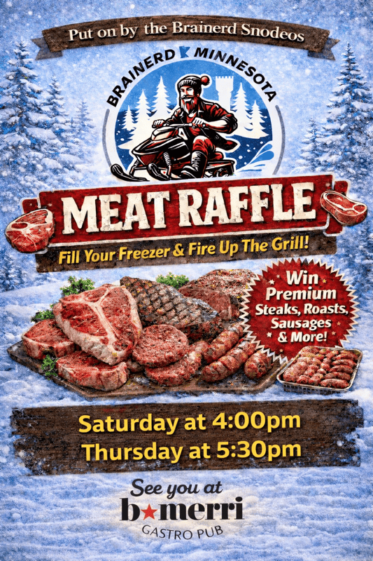 Brainerd Snodeos hosts a meat raffle every Thursday and Saturday at b*merri! Tickets go on sale at 5:30 PM on Thursdays and 4:00 PM on Saturdays, they sell for one hour or until they’re all gone! Come in and give yourself a chance to win some delicious meat to take home while enjoying drinks and food for a fun evening out!